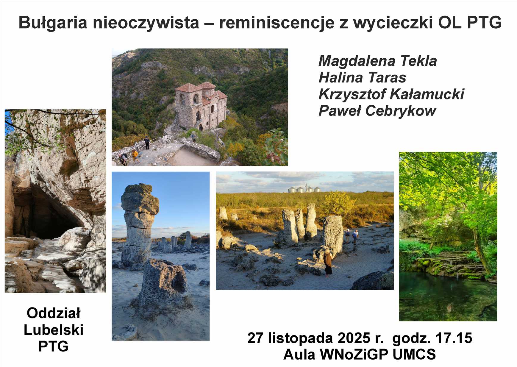 W najbliższy czwartek (27 listopada br.) o godz. 17.15, zapraszamy na odczyt w ramach cotygodniowych wykładów przygotowanych przez Oddział Lubelski Polskiego Towarzystwa Geograficznego pt.: „Bułgaria nieoczywista – reminiscencje z wycieczki OL PTG”. Wykład odbędzie się na Wydziale Nauk o Ziemi i Gospodarki Przestrzennej (al. Kraśnicka 2D) w auli im. E. Romera (I piętro). Prelekcje wygłoszą Magdalena Tekla (OOT Oddz. w Burgas), Halina Taras, Krzysztof Kałamucki oraz Paweł Cebrykow (UMCS).