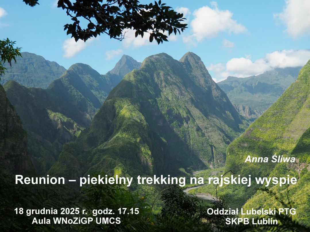 Już w najbliższy czwartek (18 grudnia br.) o godz. 17.15 zapraszamy na ostatnie w tym roku kalendarzowym spotkanie organizowane w ramach cotygodniowych wykładów przygotowanych przez Oddział Lubelski Polskiego Towarzystwa Geograficznego. Naszym Gościem będzie Anna Śliwa, która podczas odczytu „Reunion – piekielny trekking na rajskiej wyspie” opowie nam o prawie dwutygodniowym trekkingu na Reunionie: niezwykłych krajobrazach, poranku na wulkanie i zaskoczeniach, jakie niesie wędrówka w tropikach.